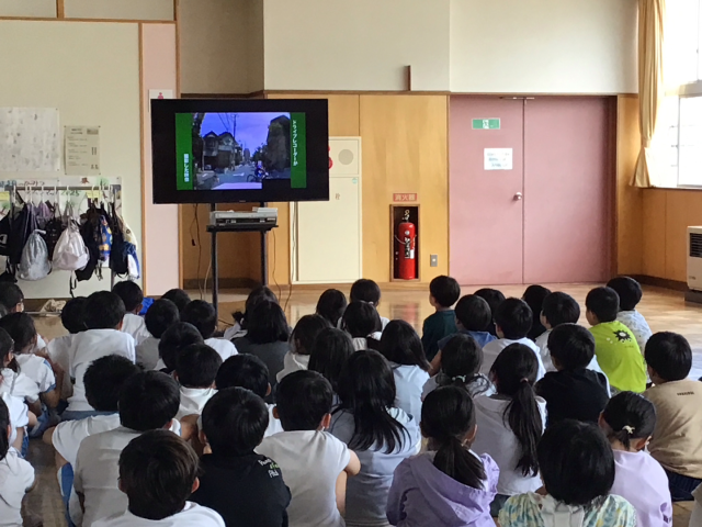 3年生の交通教室では、DVDを見て一緒にクイズに答えながら、道路の安全な歩き方や自転車の運転の仕方などについて学びました。ドライブレコーダーに映された危険な映像を見てハッとする場面もありました。特に、自転車も車両の一つとして責任があることを知り、安全に気をつけて乗ってほしいと思います。