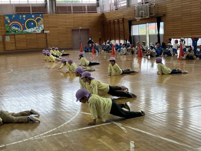 体育科の学習では「あざらしあるき」「くもあるき」「いぬばしり」に挑戦した保育所のおともだち。