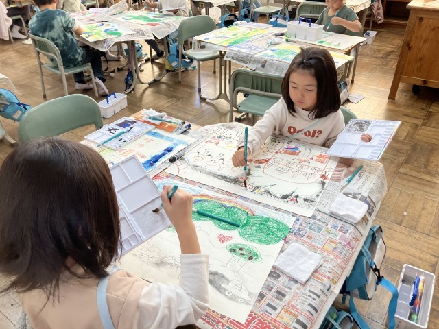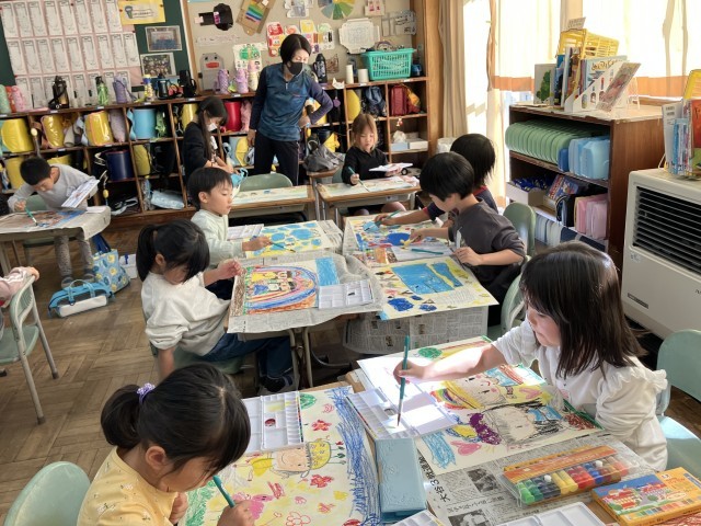 すきなお話から想像を広げて、画用紙に思い思いの絵を描きます。
