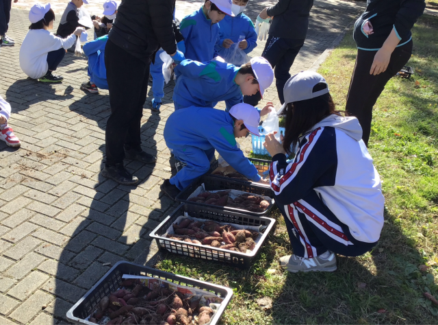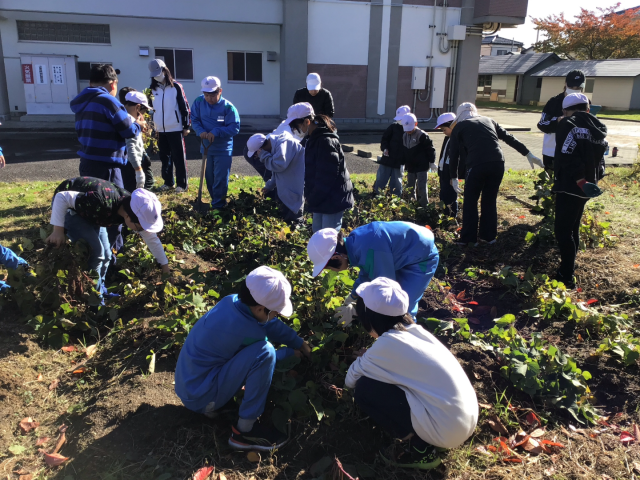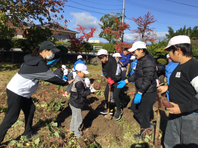なかよし・ひまわり学級では、春から畑で育てていたさつまいもの収穫を行いました。みんなでつるを引っ張り、土を掘り起こしてさつまいもを探しました。赤紫色のいもが見つかるたびに、「あった!」「やったー!」と歓声があがっていました。
