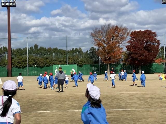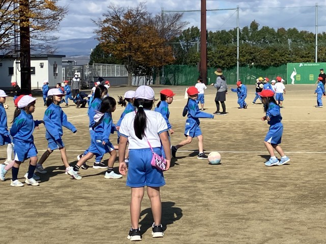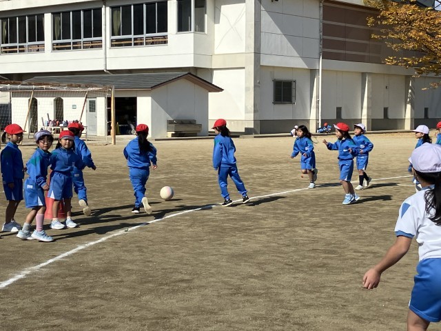 体育科では、ボールけりゲームをしています。ボールをみんなで全力で追いかけます。