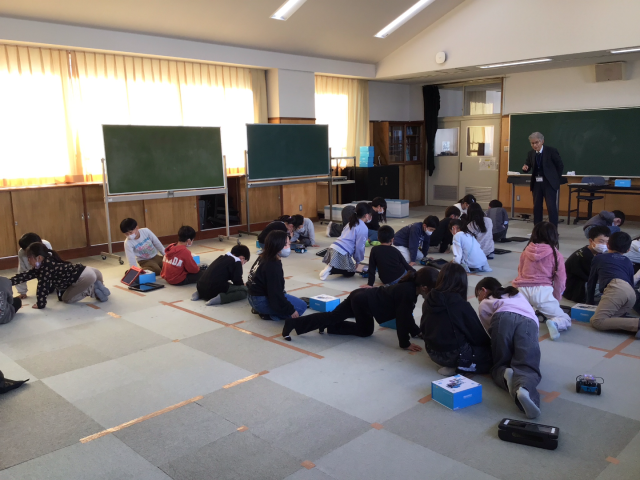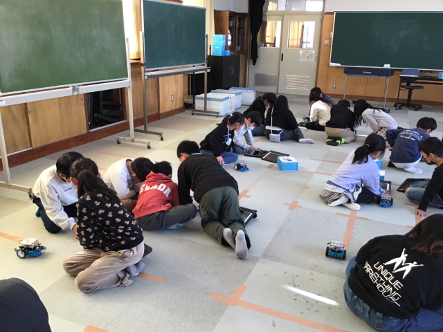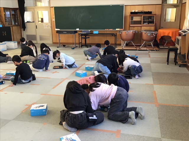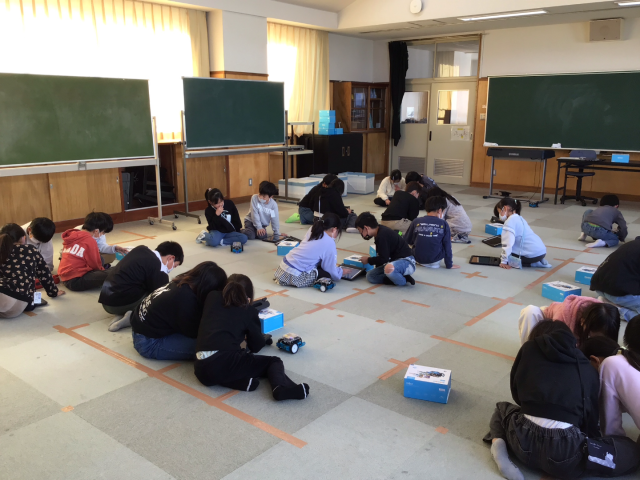 本日、mBotを使ったプログラミング授業を行いました。ICT支援員の方に教えていただきながら進めました。mBotを使うのは初めてだったので、夢中になってプログラムを組む姿が見られました。タブレットに表示されたミッションをクリアしようと、ペアで話し合い、楽しみながらプログラミングに取り組むことができました。