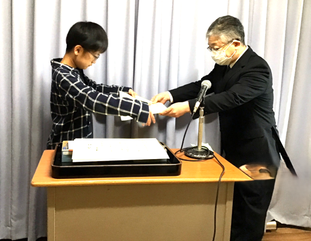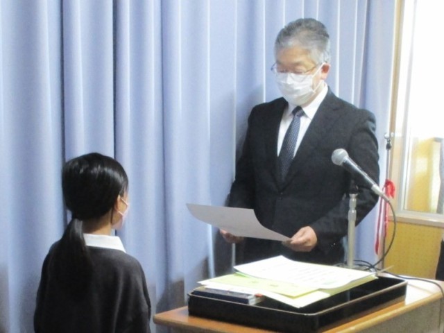 初めに表彰を行いました。市総合美術展と市児童作文コンクール、ぼくのいけん・わたしのいけんの表彰状を校長先生から代表児童に手渡されました。