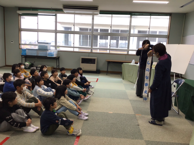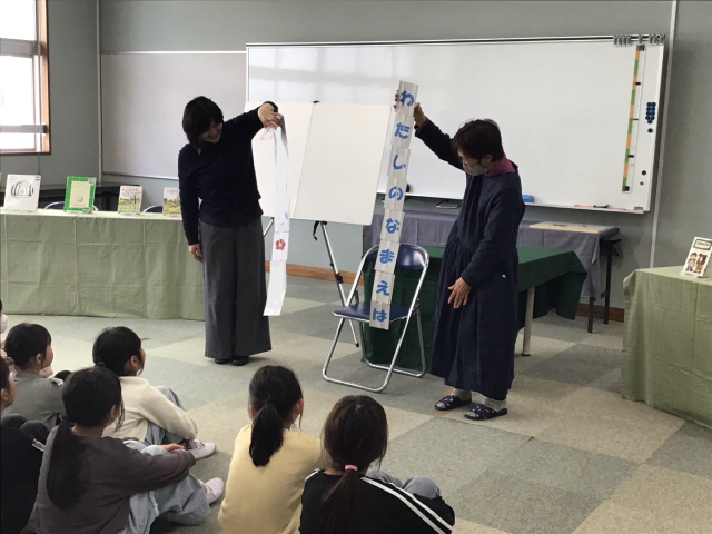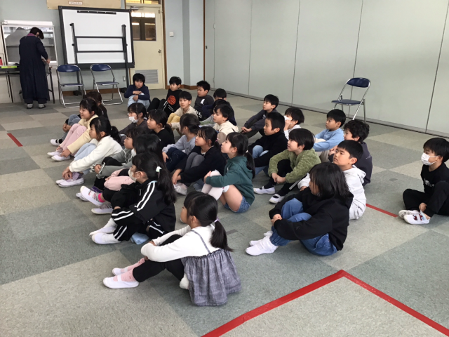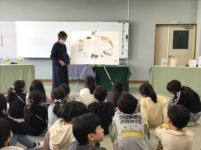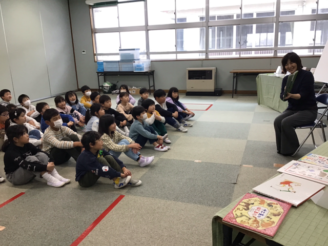 希望ヶ丘おはなし会の先生を招いて、絵本の読み聞かせをしていただきました。最初は、しかけのある名前のカードを使って自己紹介をしていただきました。パタパタとカードの文字が変わることにびっくり。その次は、山形の言葉で語り部をしていただき、どうして猿の顔は赤いのかがわかりました。最後は、パネルシアターで十二支のお話でした。ねこが十二支に入っていない理由を知り、「あぁ、そういうことなんだね。」と、みんな納得。45分間あっという間に過ぎて、とても楽しい時間でした。