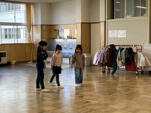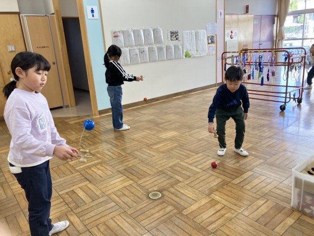 この日は、こま回し、けん玉、お手玉、竹とんぼなどに挑戦。なかなかうまくできません。むかしの遊び…だれに教えてもらったらよいのでしょう…?