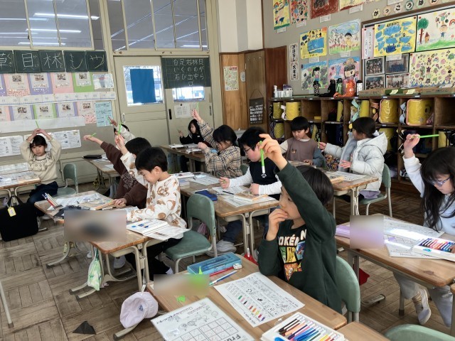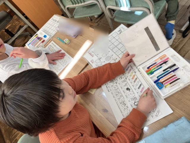 今まで学習した単語を組み合わせて、好きな色や動物、フルーツなどを発表しました。