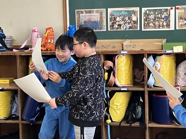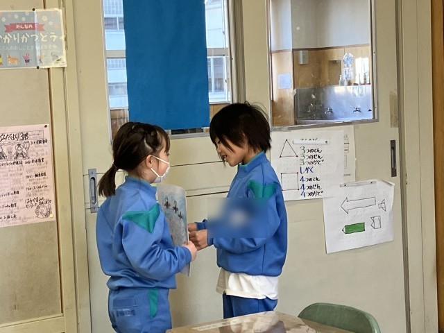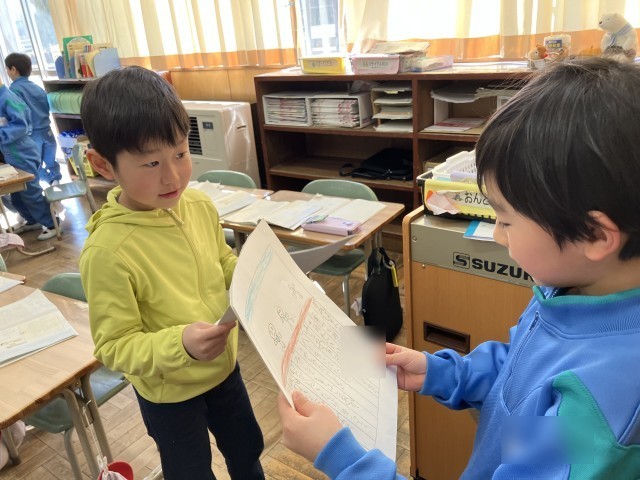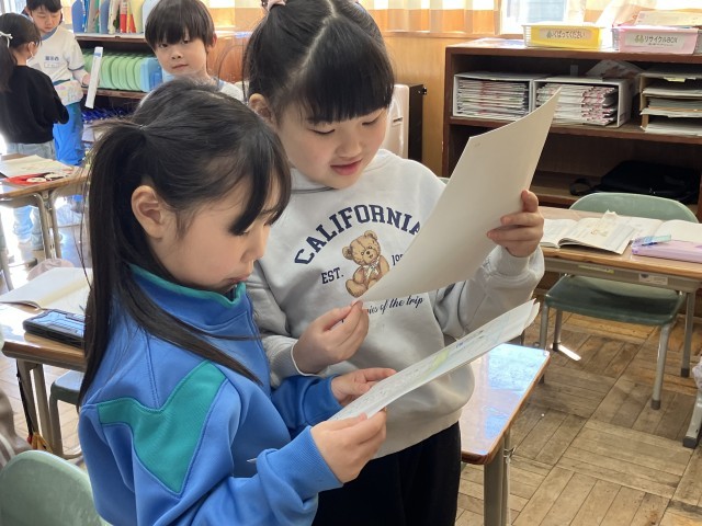 完成した作文を友達と読み合って、感想を伝え合っています。