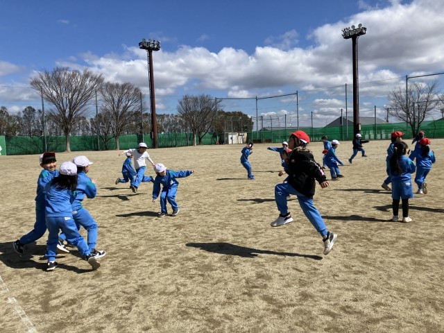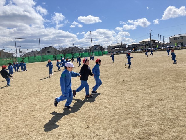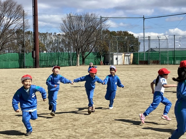 手つなぎ鬼ごっこ。手をつないで走ると、難しいけど・・・楽しい!