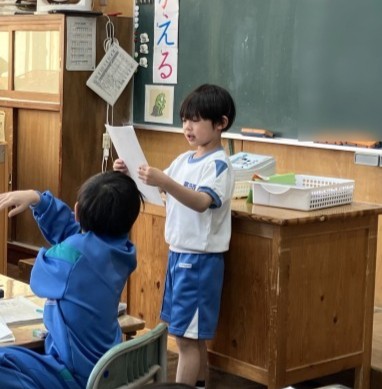 国語科。作文を書く学習です。「いいこといっぱい一年生」