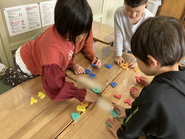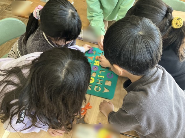 アルファベットの形や順番を、友達と相談しながら並べます。