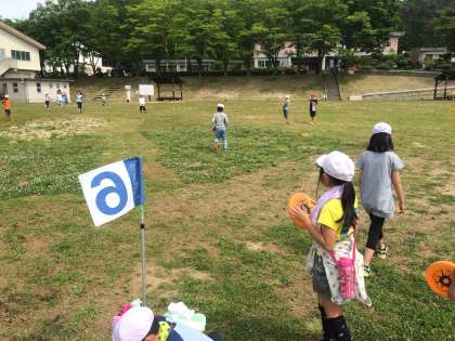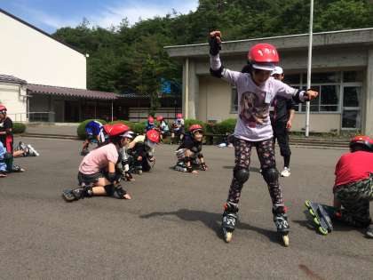 宿泊学習2日目。好天に恵まれ、インラインスケートやアーチェリー、フリスビーゴルフなどを班ごとに協力しながら楽しんでいます。