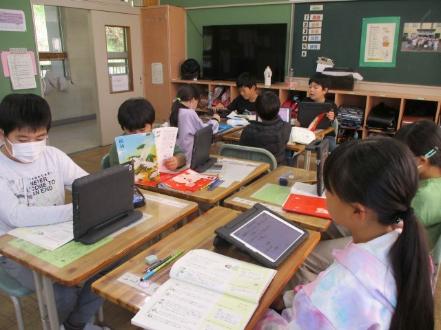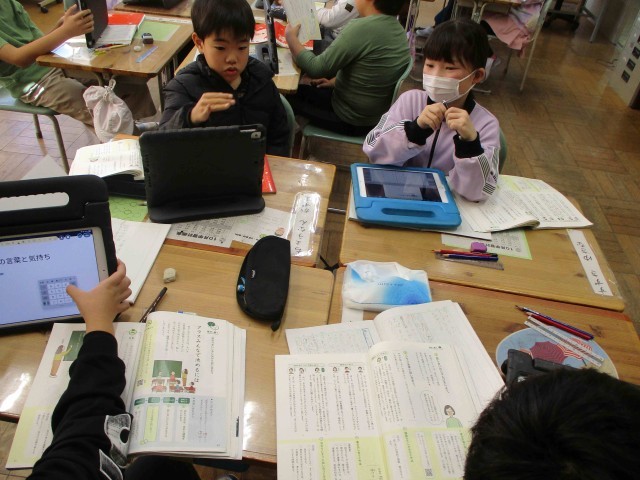 4年生の国語科では、話し合いの仕方について学習中です。班ごとに、活発に意見を出し合いながら学ぶことができていました。