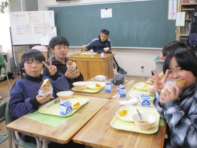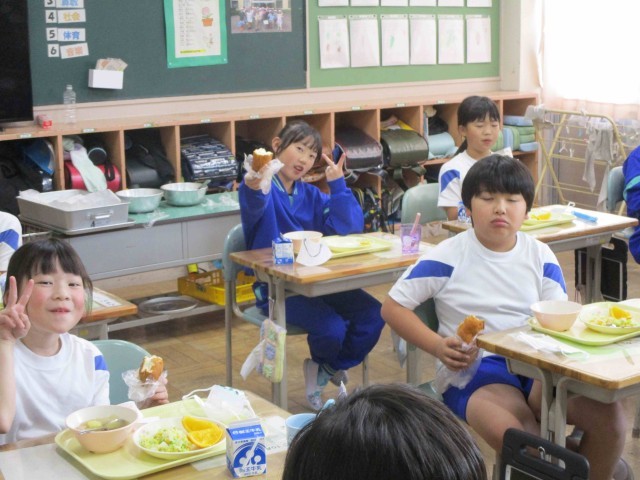 今日の給食は、みんな大好き「揚げパン」が出ました。大きな口を開け、笑顔でかぶりつきながらおいしくいただきました。
