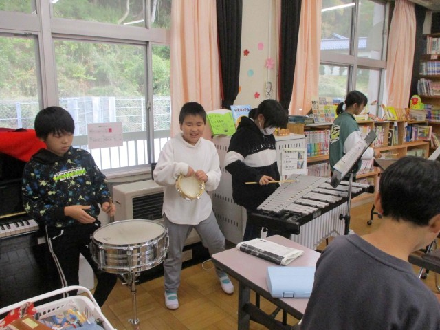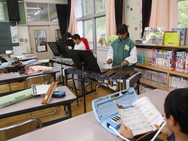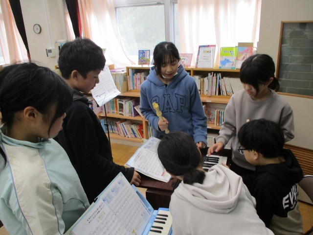 5,6年生はそれぞれの曲について、合奏の練習中です。友達と相談しながら、きれいな合奏にするにはどうすればよいのか進めていました。