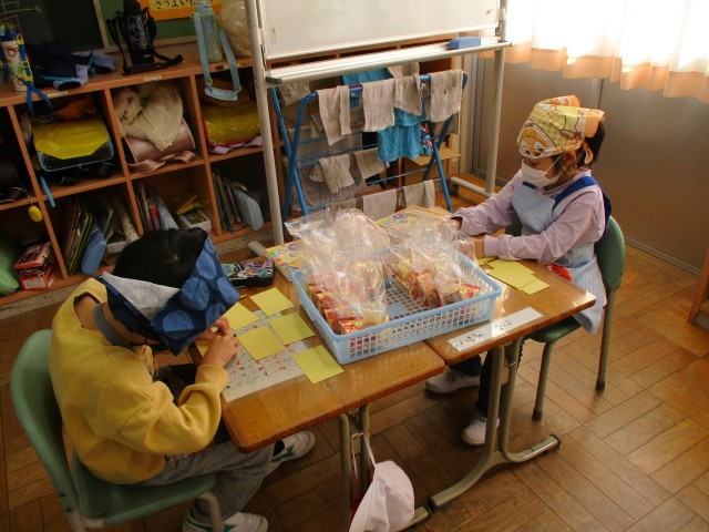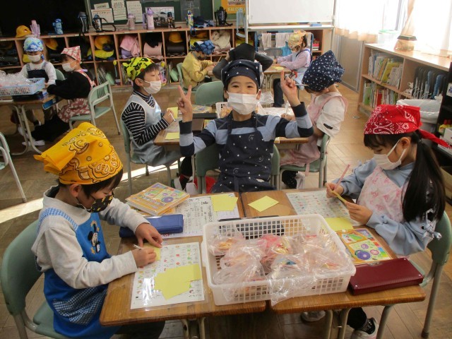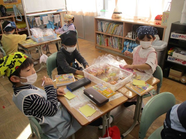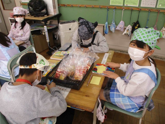今日は待ちに待った収穫祭です。1,2年生は1校時目からお菓子の袋詰めとメッセージカードを作っています。