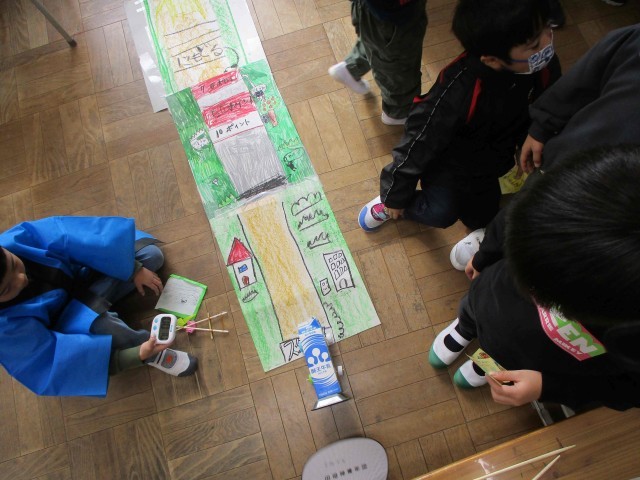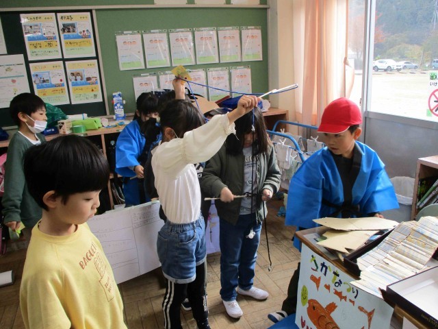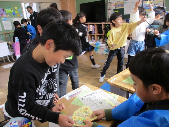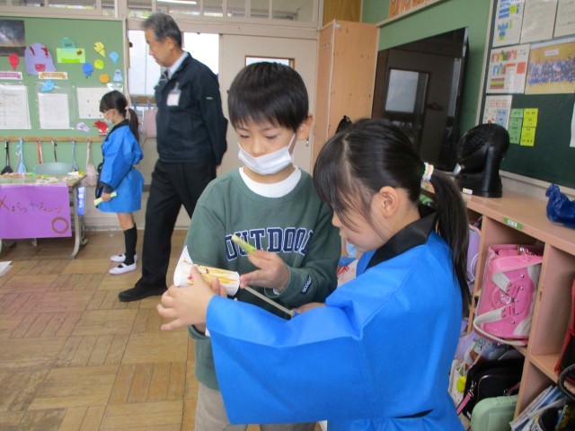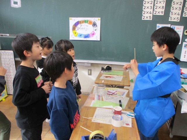朝から張り切っていた2年生。今日は1年生を招待しての「おもちゃまつり」の日です。一生懸命作ったおもちゃを並べ、1年生に楽しんでもらおうと2年生は大奮闘。2年生も1年生も大満足の「おもちゃまつり」でした。