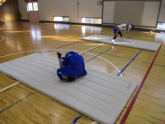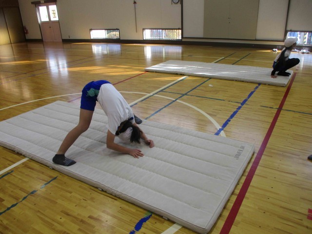 4年生はマット運動に挑戦です。後転系の技は後ろが見えないので少し怖いですが、それを克服するときれいに回転できるようになりますよ。がんばって‼