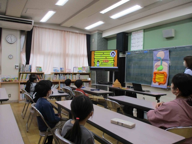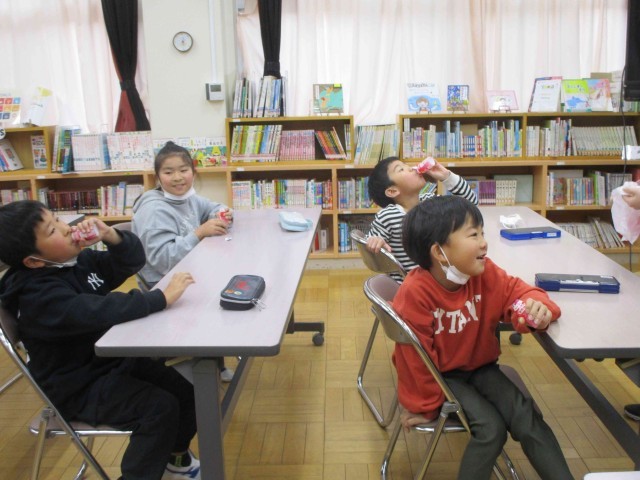 2,3年生を対象に「ヤクルトおなか元気教室」を実施しました。最後にはヤクルトを飲んで、心もおなかの中も元気になって終了しました。