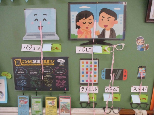 保健室前の掲示です。電子機器との距離感をはかることが出来るようになっています。タブレット、ゲーム機…、近づき過ぎていませんか。