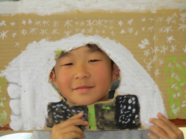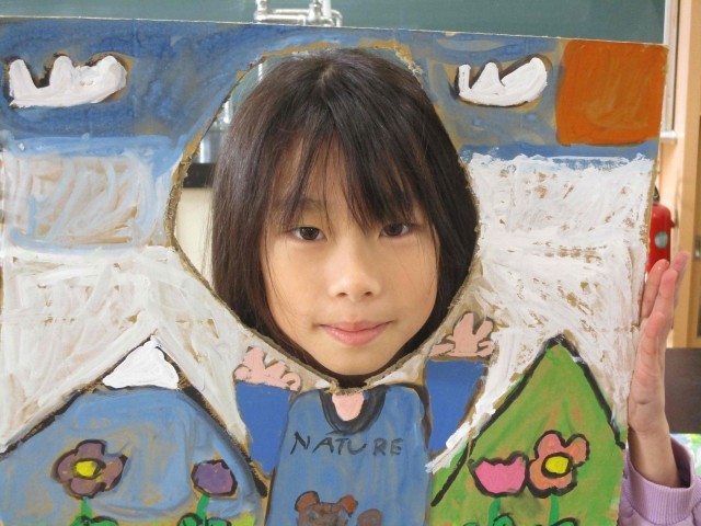 3年生の図工はとても楽しい教材です。段ボールをくり抜き、絵を付けたら、顔をのぞかせます。観光地にある「顔出しパネル」みたいで面白いですね。
