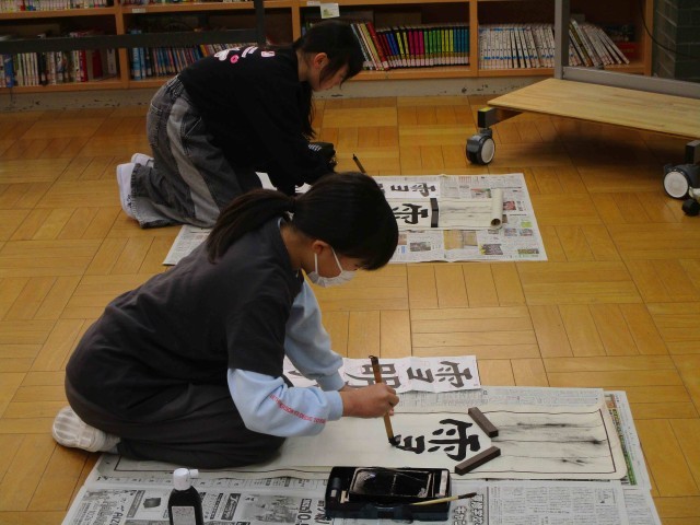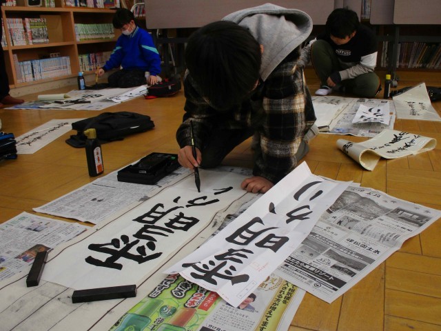 先週に引き続き今週も書きぞめ指導を実施しました。今日は4年生で「雪明かり」に挑戦です。「雪」の字がどうしても大きくなり、字の大きさのバランスを整えるのが難しいようです。