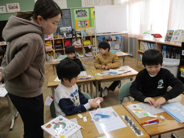1年生は引き算カードを使って、ゲーム形式で楽しく学習しています。少しでもはやく答えを出そうと一生懸命です。