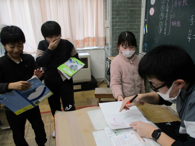 4年生は算数で、分数の学習です。仮分数を帯分数に直して、先生に見てもらっていました。ちゃんと帯分数に直せましたか~。