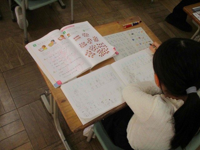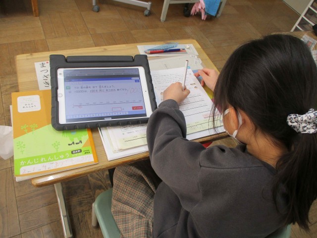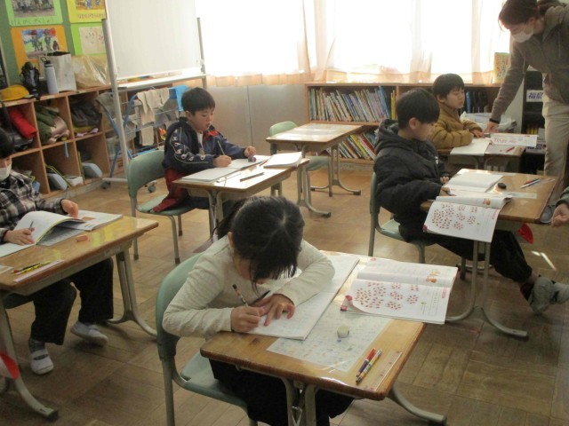 1年生は数の構成で「55はいくつといくつ」に取り組み、2年生は10000までの数について取り組んでいました。3学期まで来ると1,2年生も難しい内容に取り組むようになりますね。