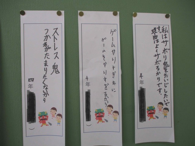 本日は節分です。各教室の掲示板には個々の「追い出したい鬼」が掲示されています。今日は節分集会で何名かの「追い出したい鬼」を発表する予定でしたが、体調不良者が多く欠席も多いため残念ながら豆まき集会は延期になりました。私個人としては、「インフルエンザ鬼」を学校から追い出したいです。