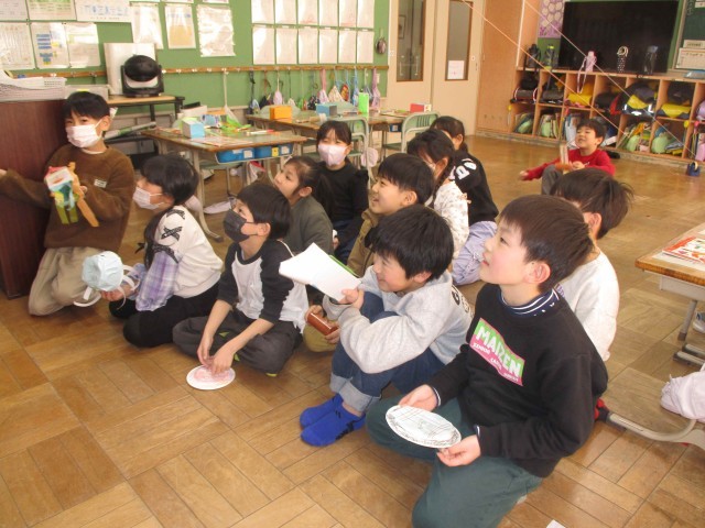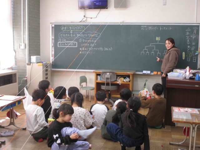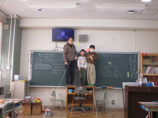 1年生の図工はとっても盛り上がっています。自分の作ったマシーンを、紐で作ったコースを滑らせます。早く滑り降りた人の勝ちというルールです。みんな大興奮で応援しています。