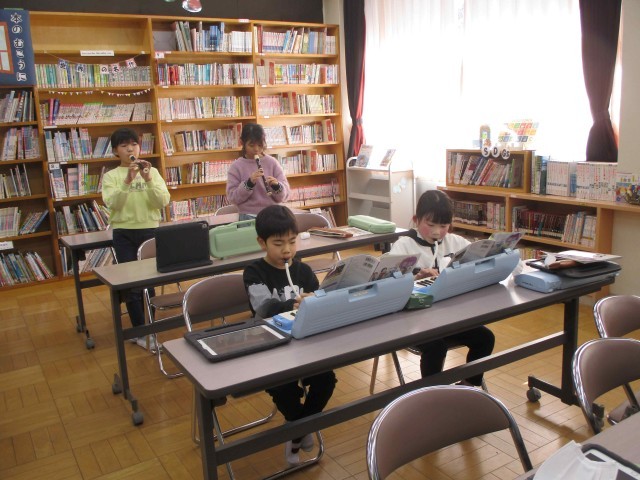 4年生は合唱チームと合奏チームに分かれ、曲を演奏中です。友達が奏でる音を聴きながら歌うのはなかなか難しいようです。