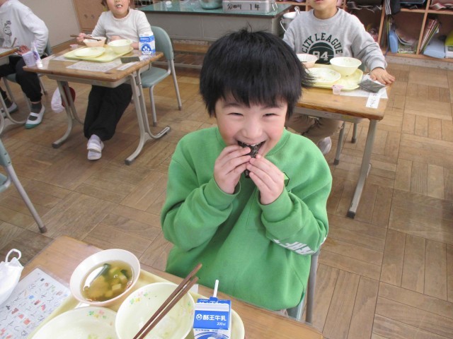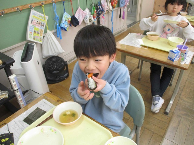 ひな祭りを明日に控えた本日の献立は「ひな祭り献立」です。みんな大好き手巻き寿司、お吸い物、ツナサラダ、ひな祭りゼリーで、美味しくいただきました。手巻き寿司を作るのも楽しそうでした。