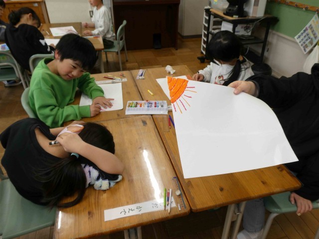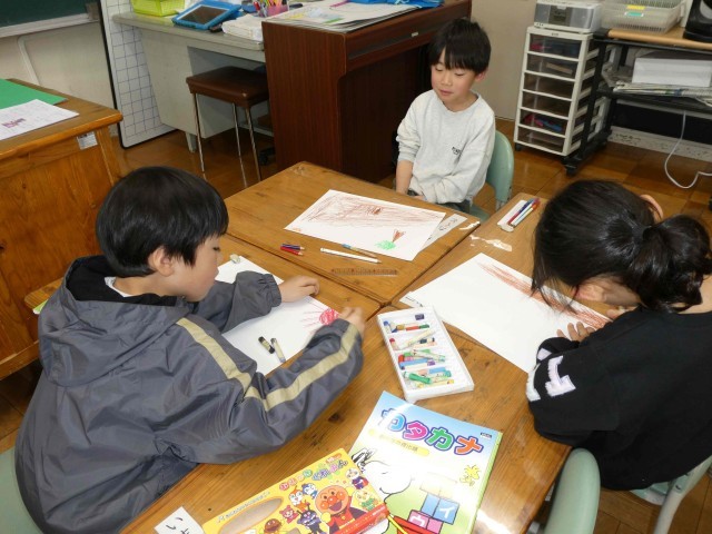 来年度入学の1年生の教室掲示のために、年間行事を絵に描いていました。何をするにも楽しそうな1年生です。