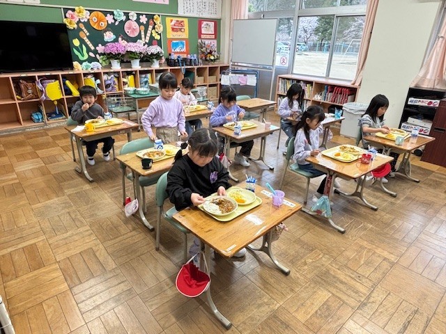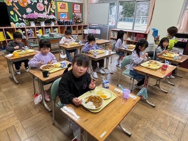 子供たちの人気メニューのカレーライス!美味しい給食に子どもたちも笑顔になっていました。