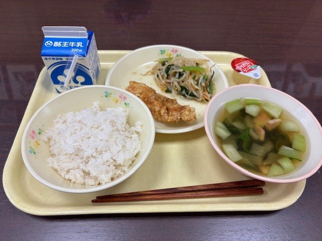 本日の給食は、麦ごはん、牛乳、揚げ鶏の香味ソースかけ、もやしのラー油あえ、わかめスープ、すりおろしりんごゼリーミニでした。