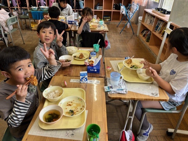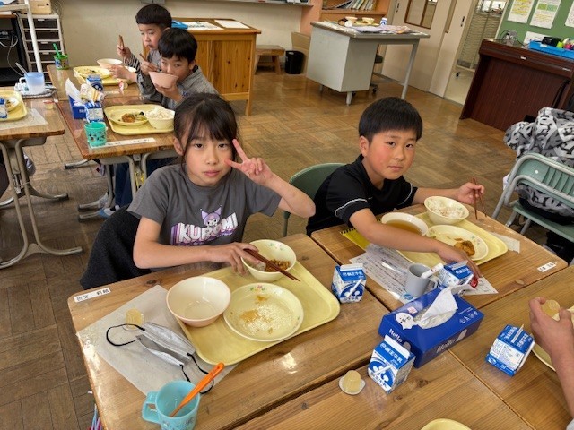今日は、3・4年生の教室におじゃましました。子どもたちは、「おいしい!」という声とともに、給食をもりもりと食べており、教室は笑顔であふれていました。