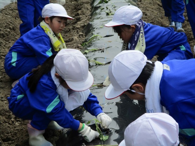苗植えには絶好の天候の中、1,2年生がさつまいもの苗植え、3年生以上が田植えを行いました。どちらの苗植えも終始子どもたちの歓声に包まれ、楽しみながら、そして、自然を満喫しながら苗植えができました。今から秋の収穫祭が楽しみです。