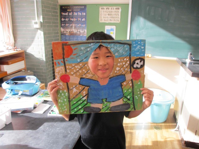 3年生の図工はとても楽しい教材です。段ボールをくり抜き、絵を付けたら、顔をのぞか...