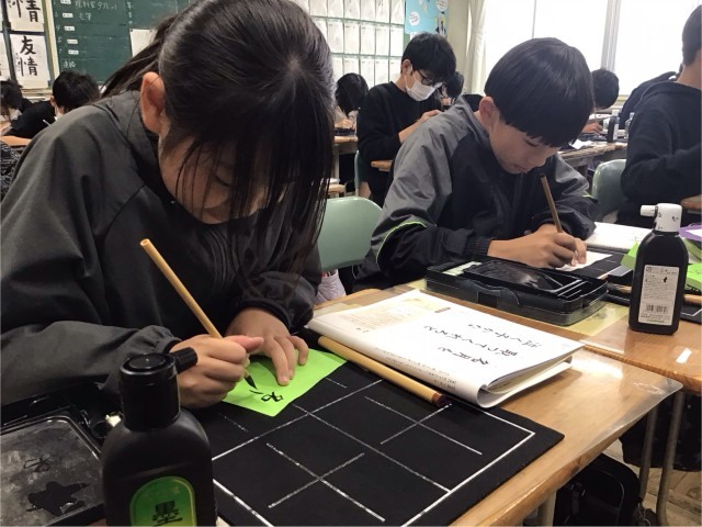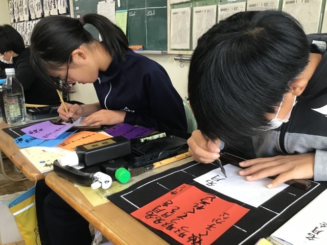 書写では、用紙の大きさに合わせて字を書いています。今日は清書の提出だったのでより、集中して取り組んでいました。