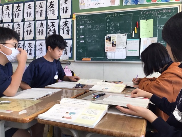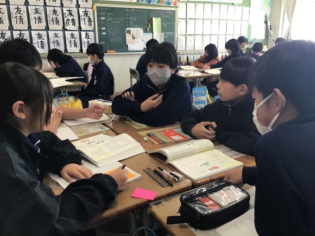 「みんなで楽しく過ごすために」の学習では、1年生が楽しむこととより仲良くなることの2つを目的に、できることを班ごとに話し合っています。一人一人がよりよいまとめることができるように考えを伝え合いました。