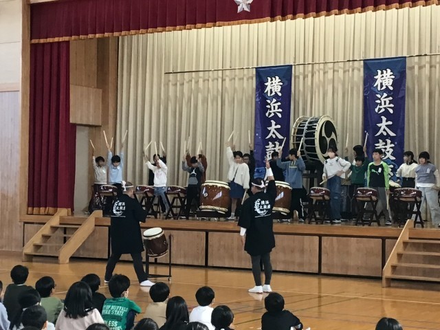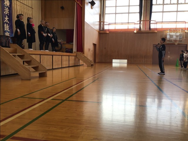 今年の鑑賞教室は「横浜太鼓座」による和太鼓の演奏でした。太鼓の拍子に合わせて手拍子をしたり、代表のお友だちが太鼓の体験をしたりしました。会の最後には、代表として6年生がお礼の言葉を立派に伝えることができました。