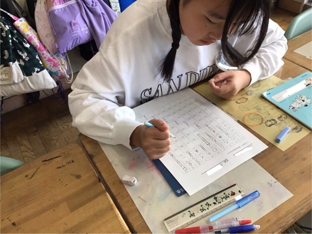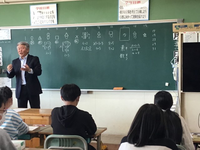 時々、算数の時間にお世話になる学力向上アドバイザーの先生に、中学校で学習する「素数」の授業をしていただきました。みんな真剣な表情!100マスある数の中から素数を一生懸命探していました。