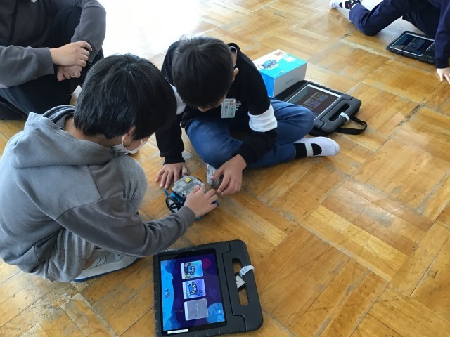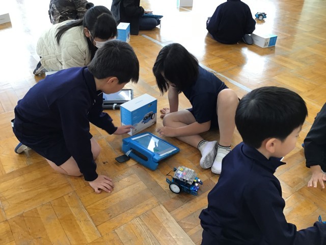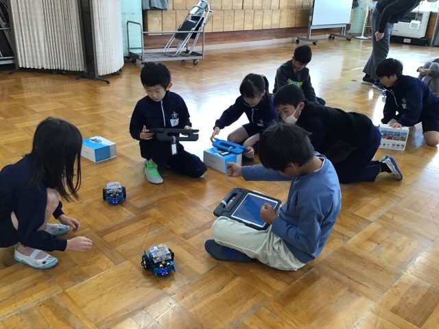 ちょっと前までスクラッチの学習をしましたが、今日からプログラミングの時間は、mーBotという車をプログラミングして動かすという学習が始まりました。子どもたちは、目をキラキラさせながら夢中になって取り組んでいました。