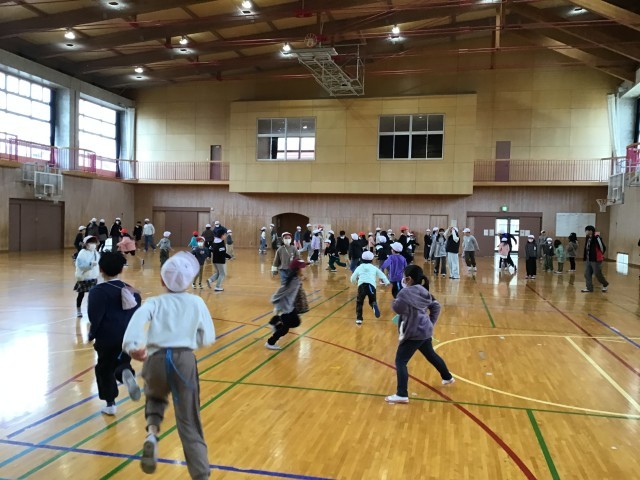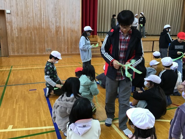 集会委員会が企画した「なかよし集会」がありました。1年生から6年生までの縦割り班で、楽しくしっぽとりゲームを行いました。