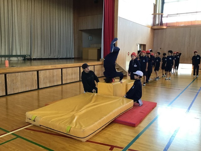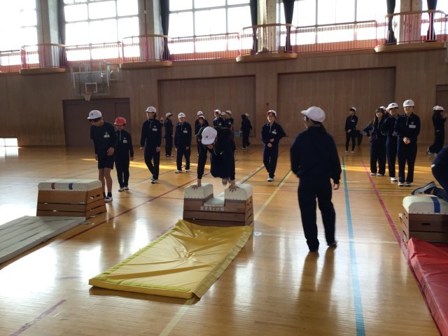 小学校の跳び箱運動のまとめとして、開脚跳び、かかえこみ跳び、台上前転、頭はねとびの中から選んで練習しました。