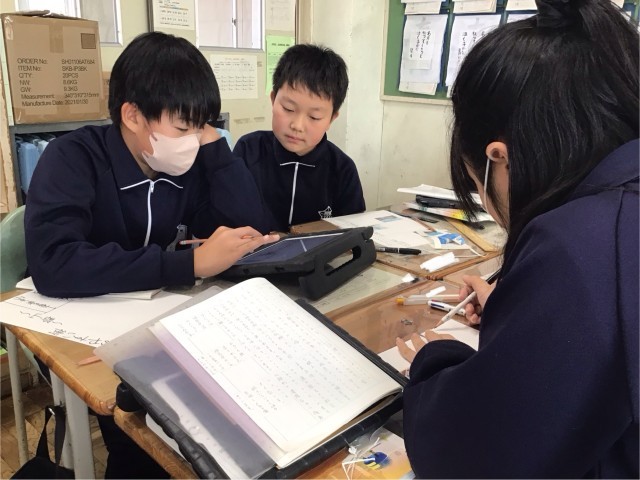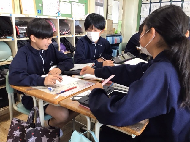 国語では、パンフレットを作る学習を班ごとに行っています。