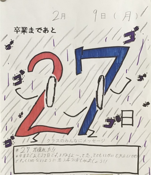 卒業まで27日です。今日は、6年生送る会で歌う歌の練習をしました。1回目の練習の時より歌声がまとまってきました。伴奏のお友達も素晴らしい演奏でした。