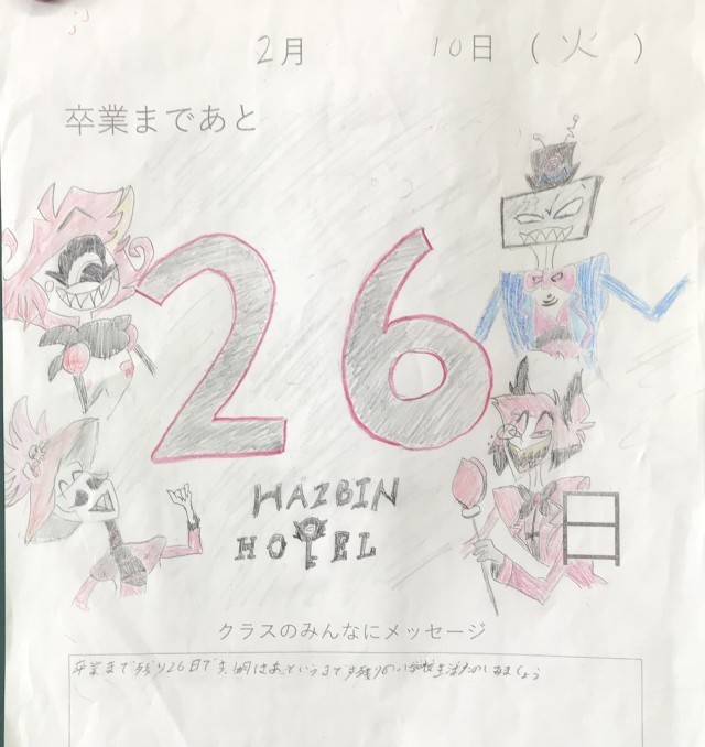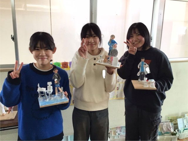 卒業まで、あと26日です。今日は、「未来のわたし」の作品に色を塗りました。紙粘土に色付けするのが大変そうでしたが自分の未来を上手に表現していました。