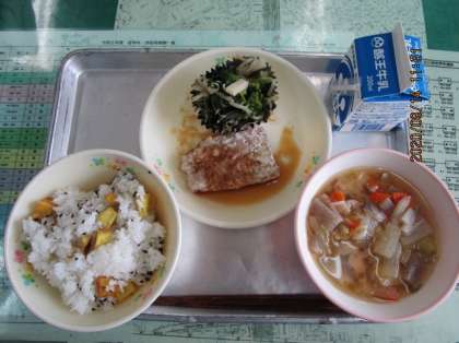 今日のメニューは、さつまいもごはん、豚汁、さんまのかば焼き、青菜の和え物です。