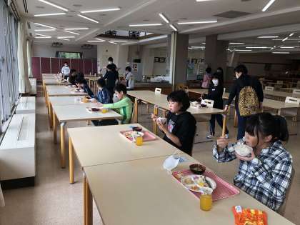 朝の食事は、感染症対策のため、全員前を向いて食べています。
